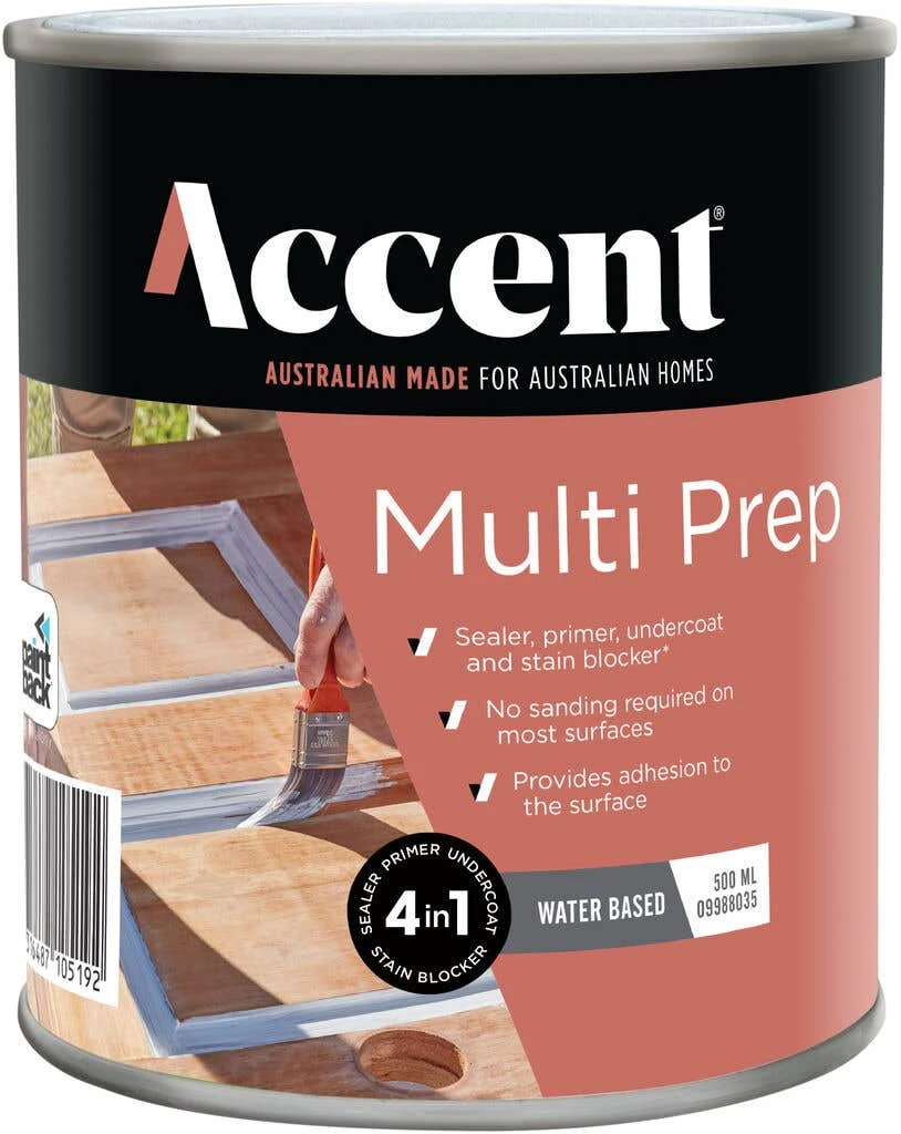 An all-in-one solution, the Multi Prep is a convenient product to have on hand in the workshop. Accent Acrylic Multi Prep Water Based White 500mL makes sealing, priming and staining wood easier than ever. Just one product for a variety of jobs including sealer, primer, undercoat and stain blocker in one. It can be used as a sealer, primer, undercoat and stain blocker to top coat with acrylic paint. This water-based product dries quickly and easily cleans up your hands and brushes.
