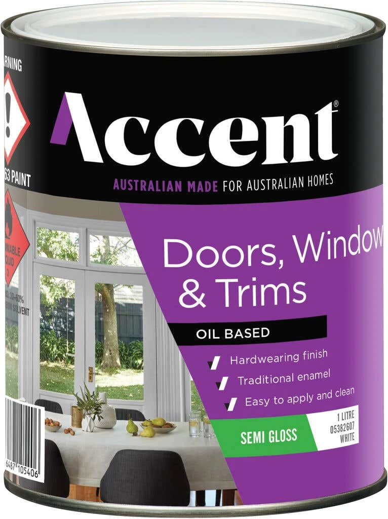 Accent Doors, Windows and Trims Semi Gloss is a traditional oil-based enamel suitable for interior projects. A tough, hard-wearing smooth finish that is easy to apply and easy to clean. Suitable for use over water and oil-based coating.