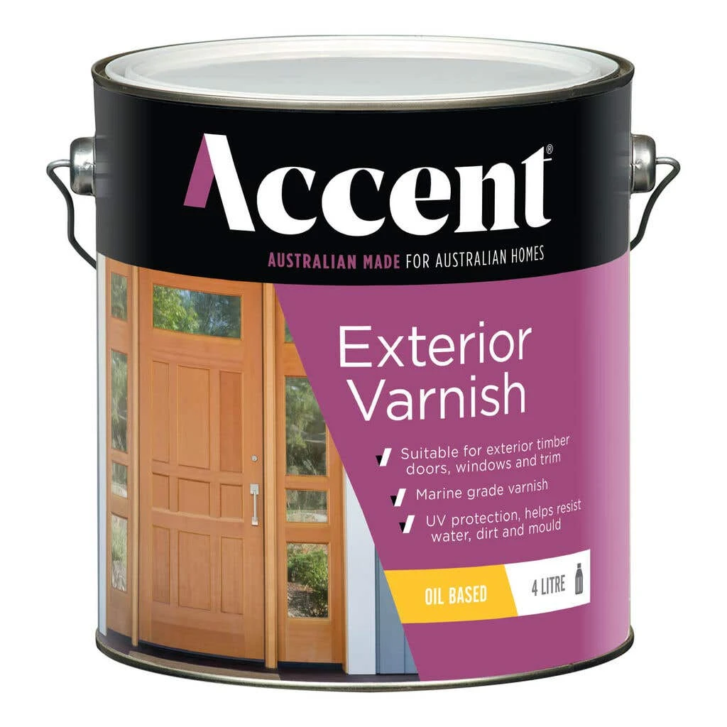 Accent Exterior Varnish is a marine grade varnish, suitable for exterior timber doors, windows and trim. The clear coating helps protect against UV and resist water, dirt and mould. Whether you’re a homeowner looking to protect your exterior wood surfaces or a professional tradesperson needing a reliable and high-quality varnish, Accent Exterior Varnish Oil Based Gloss Clear 4L is an excellent choice. With its durable and long-lasting finish, easy application, and superior resistance to outdoor elements, this product provides excellent value for money and is sure to exceed your expectations.