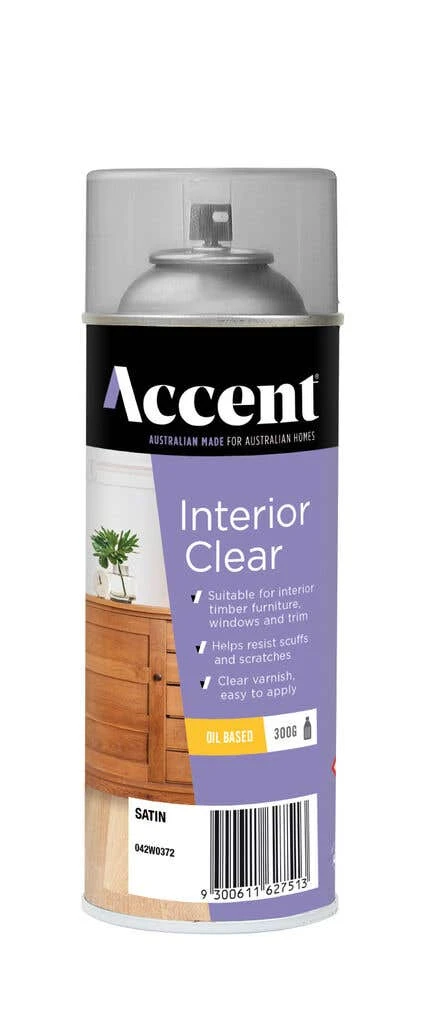 Accent Interior Clear is an oil based varnish suitable for interior timber furniture, windows and trim. The clear varnish provides protection without hiding the timber grain. Whether you’re looking to protect your interior wood surfaces or enhance their natural beauty, Accent Interior Clear Spray Oil Based Satin 300g is the perfect solution. With its durable and long-lasting finish, easy application, and superior resistance to wear and tear, this product is ideal for homeowners and professionals alike who prefer the convenience of a spray nozzle. Plus, its compact 300g size makes it easy to store and use whenever you need it.