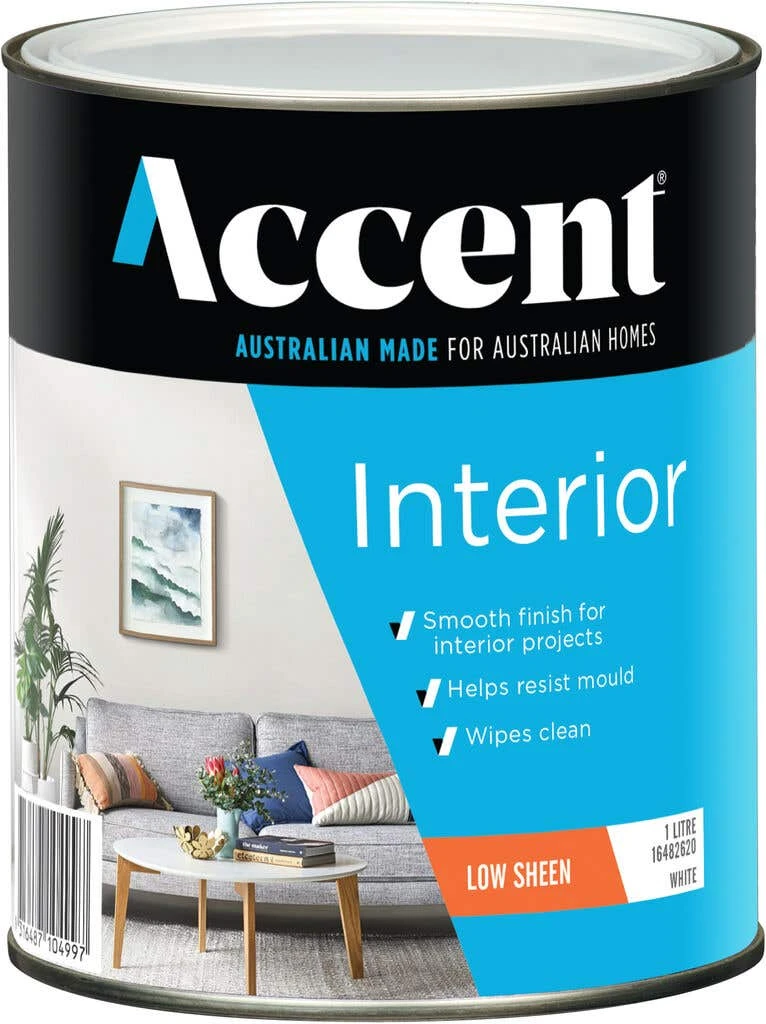 Accent® Interior paint is perfect for all your home projects whether you’re refreshing a wall or refurbishing a room. No undercoat is required on most previously painted surfaces You can rely on Accent paint to deliver a quality finish and the satisfaction of a job well done. In cool or humid conditions allow longer dry times. Ensure the temperature is above 10°C during application and drying. Up to 16m2 per litre coverage (depending on the surface). Easy water clean up with a low Sheen providing a low level of shine