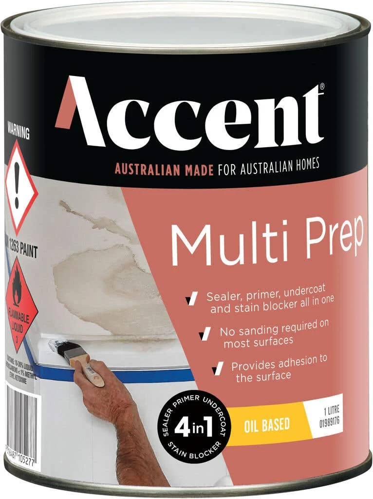 Accent Multi Prep Oil-based White 2L is a premium, general-purpose paint that can be used as a sealer, primer and undercoat in one. No sanding is required! It provides adhesion to the surface on most surfaces, including inside walls and ceilings. It provides adhesion to the surface, which results in great durability and colour depth. This oil-based white is a great household paint for kitchens, bathrooms and laundries.