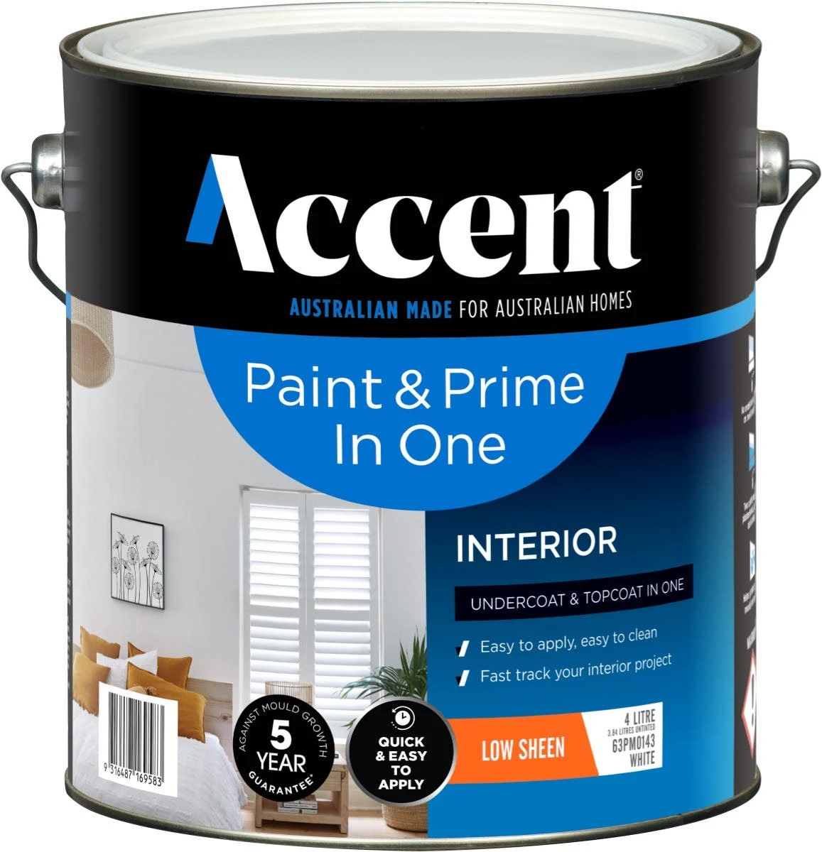 Accent Paint & Prime is an undercoat and topcoat in one. Only two coats are required over bare plasterboard, plaster join and repairs as well as dark colours. Cool or humid conditions allow longer dry times. Ensure temperature is above 10°C during application and drying. Up to 14m2 per litre coverage (depending on the surface). Easy water clean up and has a low Sheen for a low level of shine. When applying the paint, use a good-quality brush for any areas not accessible with a roller. When using a roller, use a medium nap (10-14mm) synthetic roller. Using other roller types will affect the final finish achieved.