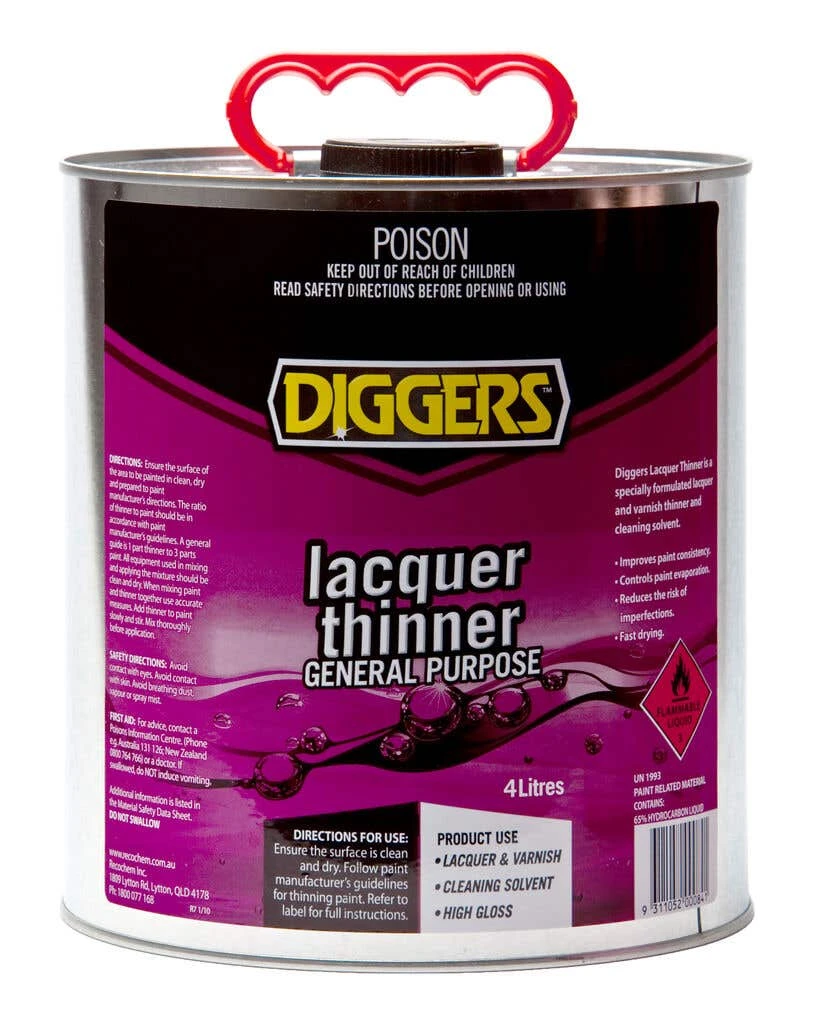 With Diggers General Purpose Lacquer Thinner you can thin most lacquers and varnishes, whilst being Safe for the Environment. It’s also ideal for cleaning lacquer and varnish, removing chewing gum, inks and other plastics. Use it to restore gloss to damaged lacquer finishes, for recoating raw wood and plaster, wipe over tools, surfaces and equipment before painting is applied.