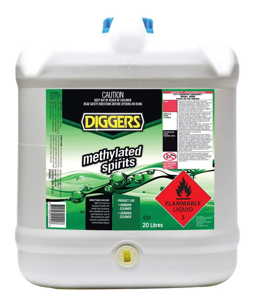 Digger’s Methylated Spirits 20L has denatured alcohol and a heavy-duty household cleaning agent. It is commonly used as a hard surface cleaner and disinfectant. When added to water it makes an effective window and floor cleaner due to its ability to cut through tough dirt, grease and grime.