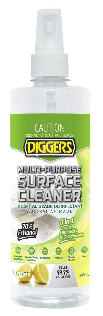 Diggers Multi-Purpose Surface Cleaner is a hospital grade disinfectant, surface cleaner and deodoriser in 1. Containing natural scented methylated spirits this ready-to-use formula is proven to kill 99.9% of germs and has a fresh lemon scent.