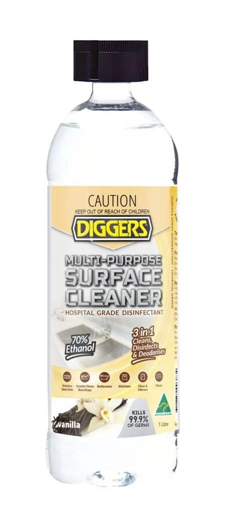 Diggers Multi-Purpose Surface Cleaner is a hospital-grade disinfectant, surface cleaner and deodoriser in 1. Containing natural scented methylated spirits this ready-to-use formula is proven to kill 99.9% of germs and has a fresh vanilla scent.</p