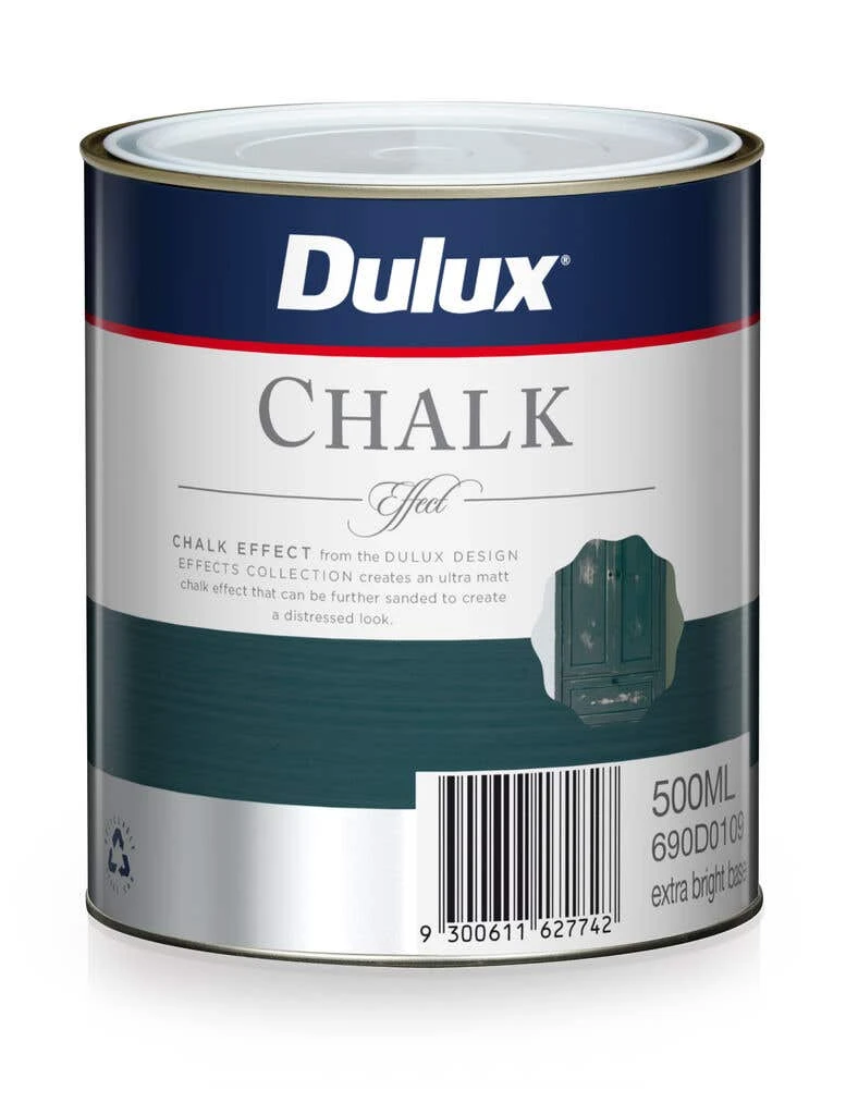 Dulux Design Chalk Effect is designed to be used on interior surfaces such as walls, cornices, cupboards, panelling and furniture throughout your home. Leave the finish with an ultra matt chalky appearance, or sand to achieve the vintage distressed look of pieces that have become naturally worn over time.