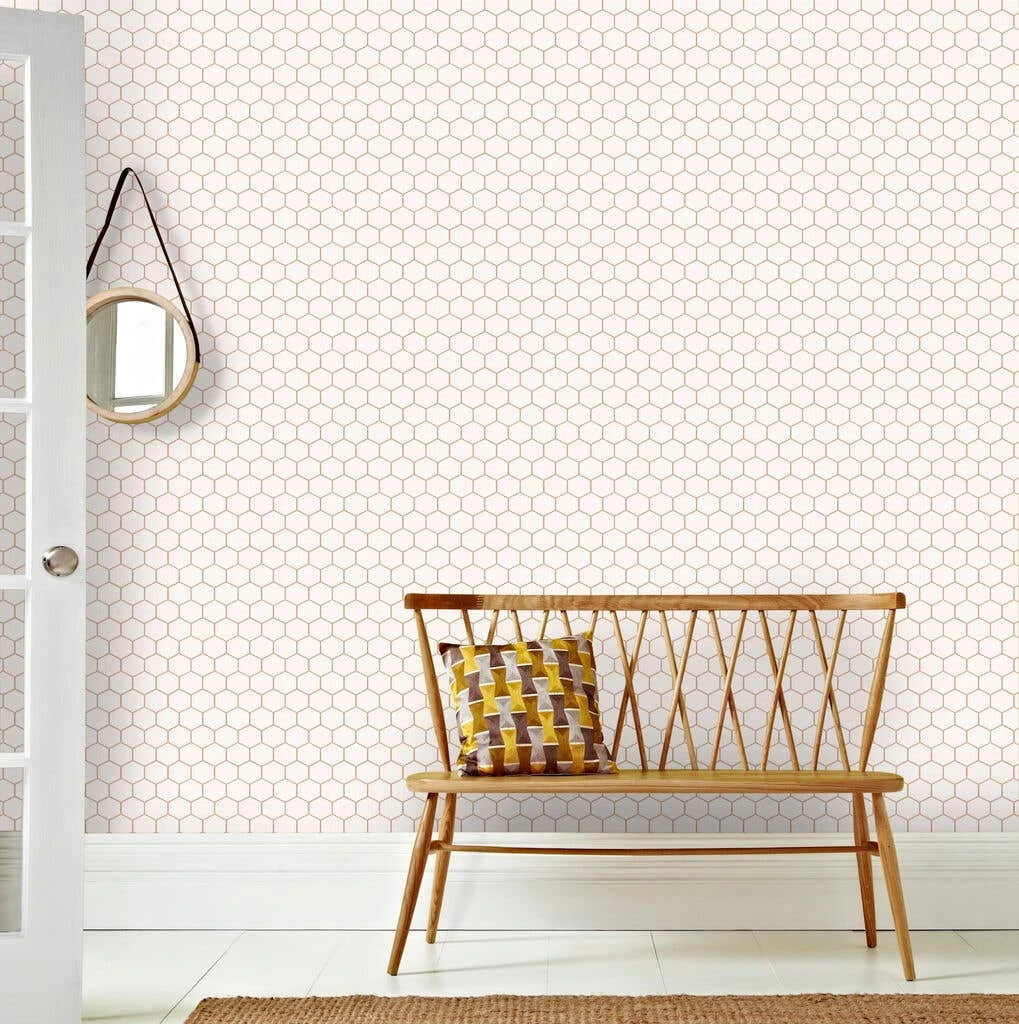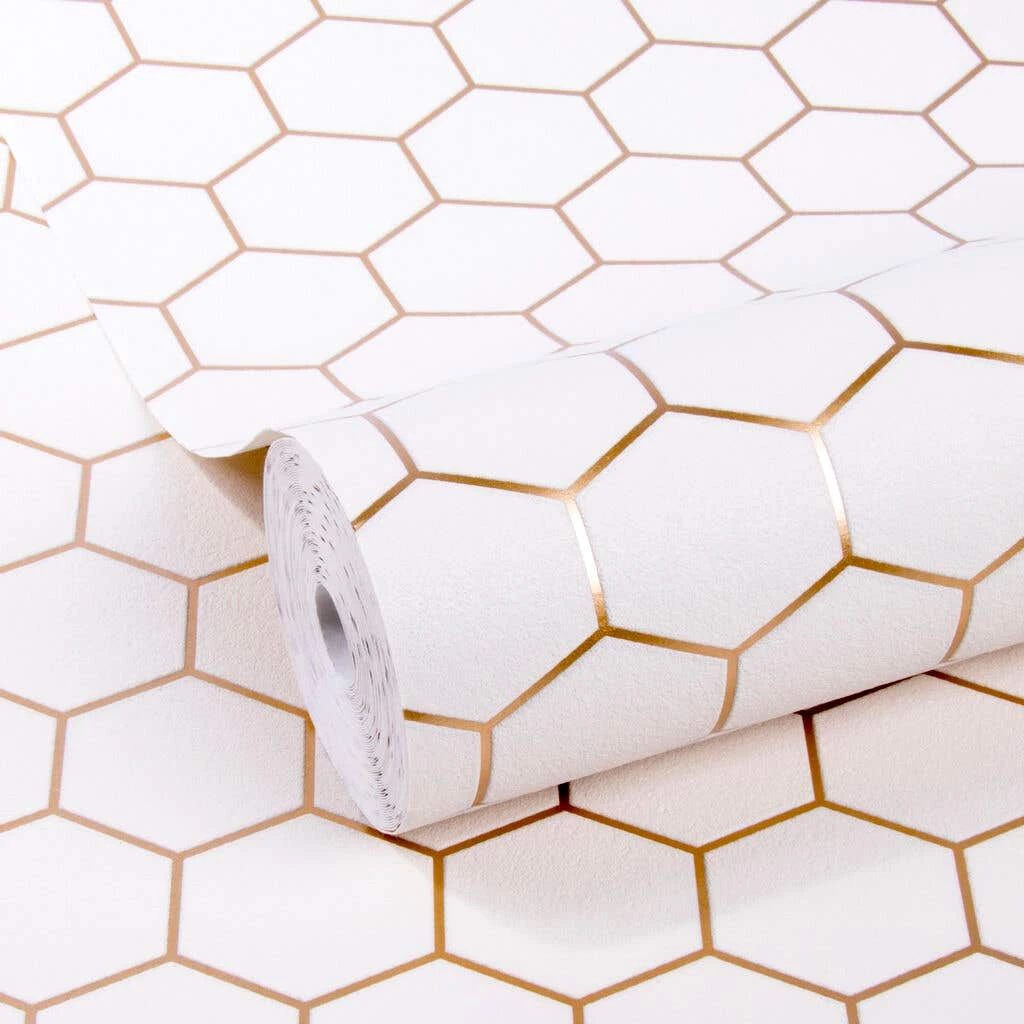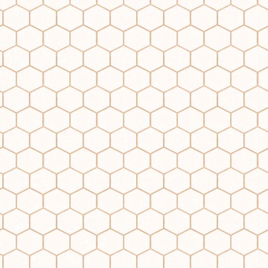 This geometric tile-style design has a sustainable theme. Featuring a honeycomb style print, with a white base and gold line detail. This crisp design is perfect for adding unobtrusive detail to your living spaces. This wallpaper is easy to apply and remove from your walls.
