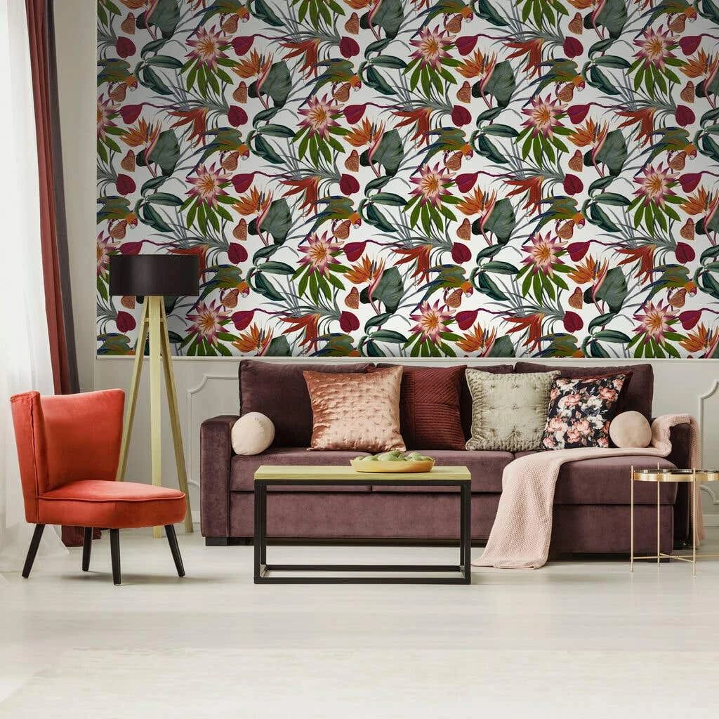 Make your own statement with this gorgeous jungle style design, featuring a white backing, and rainbow bird and nature detail. A sanctuary themed design that oozes statement and will add the WOW factor to any living space. This design is easy to apply and remove from your walls.