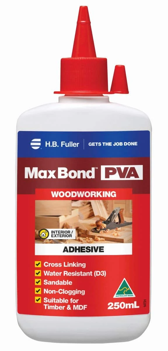 MaxBond PVA is a professional quality, cross linking water resistant adhesive that resists soaking into end grain. The cross linking formulation assists in creating a stronger, water and heat resistant bond and reduces the chance of substrates separating over time under stress.