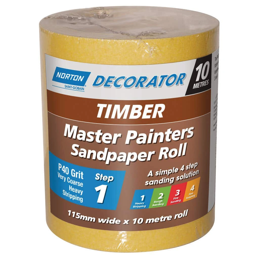 The Norton Decorator Sandpaper Roll is a 4-step process suitable for sanding wooden surfaces. Step 1 is P40 very course grit for heavy stripping. Step 2 is P60 medium grit for rough sanding. Step 3 is P80 fine grit for fine sanding. Step 4 is P120 extra fine grit for fine finishing.