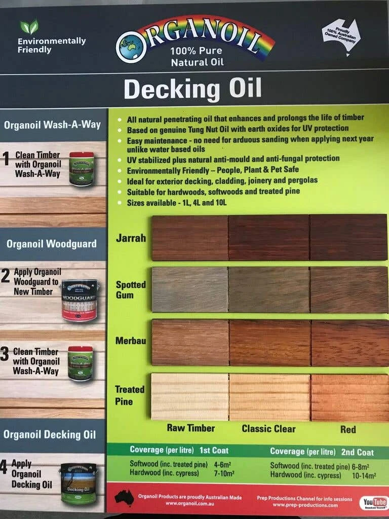 Organoil Decking oil is an environmentally friendly oil where the ingredients are sourced from sustainable resources. Organoil provides a natural alternative to waterbased and Petrol Chemical based decking oil.