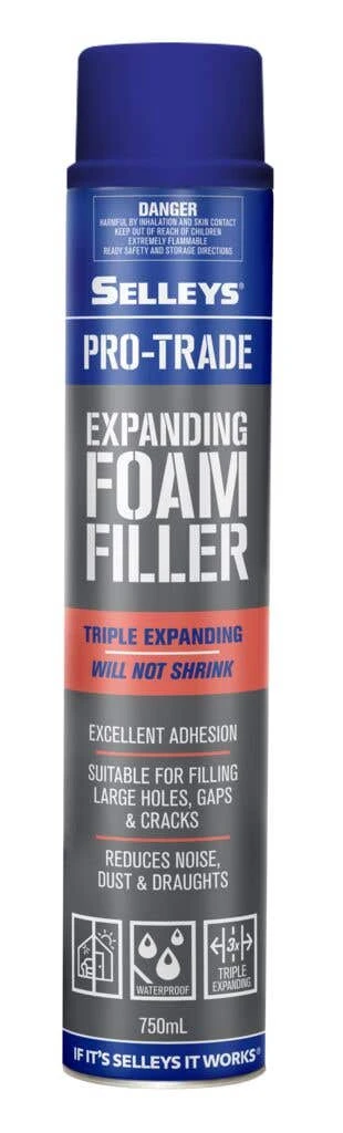 Selleys Pro-Trade Expanding Foam is designed for filling gaps and holes in walls, ceilings, doors and windows. It can be easily be sanded, plastered, grouted, cut or caulked and if required painted to match the finish of your wall, ceiling or door.