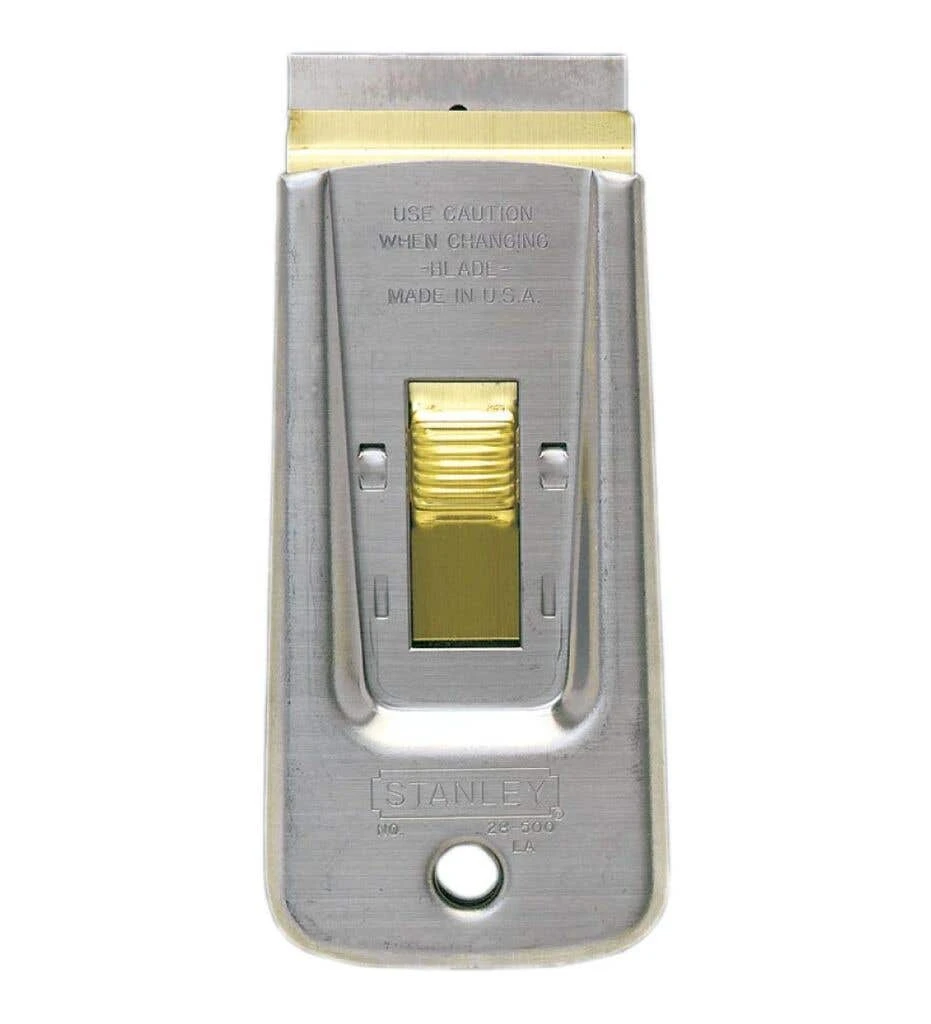 This razor blade scraper with 5 replacement blades and makes for a great tool when it comes to removing paint, glue, putty or other adhesives from glass, tile, walls, floors or any other smooth surfaces. The scraper uses standard single-edge razor blades and these blades retract for safe storage. Its heavy-duty metal construction offers it a long-lasting life.