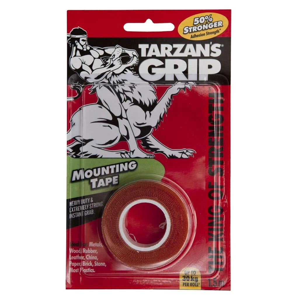 Tarzan’s Grip Mounting Tape is a double-sided, heavy-duty, high strength tape that instantly grabs for easy, fast and permanent mounting. It is ideal for a multitude of surfaces, including metal, wood, rubber, leather, china, brick, stone, plasterboard and most plastics.