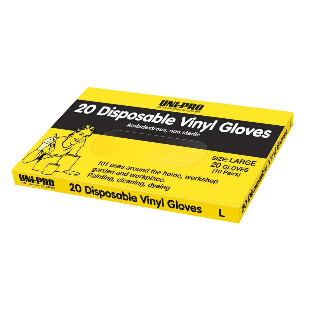 The Uni-Pro Disposable Vinyl Glove Large – 20 Pack is a must-have for any enthusiast, painter or handyman. The gloves are designed to be durable, comfortable and easy to use. Made from high-quality vinyl, they provide excellent protection against a wide range of chemicals, including paint, solvents, and cleaners.