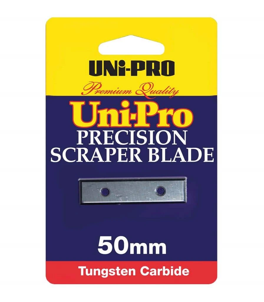 Tungsten carbide blade for paint removal and scraping of most surfaces including wood, tile, and concrete. Rounded blade for easy scraping in corners. The blade is reversible for different applications.