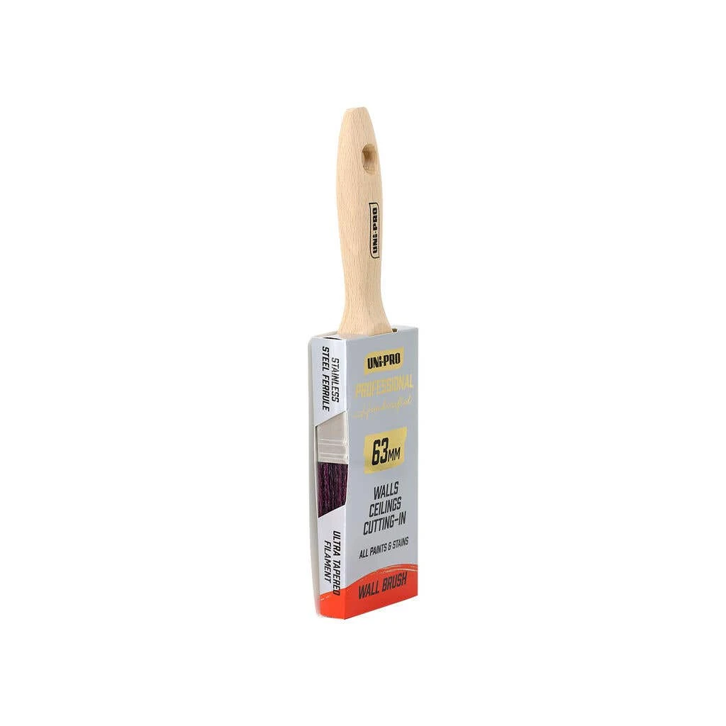 The Uni-Pro Professional Wall Brush 63mm is 100% hand-crafted and features an exclusive SC2 premium blend, ultra-tapered filament. The brushes have been designed for the trade and will deliver exceptional results. A perfectly balanced beech hardwood handle offers maximum comfort and control, and the double-pinned stainless steel ferrule ensures maximum durability.