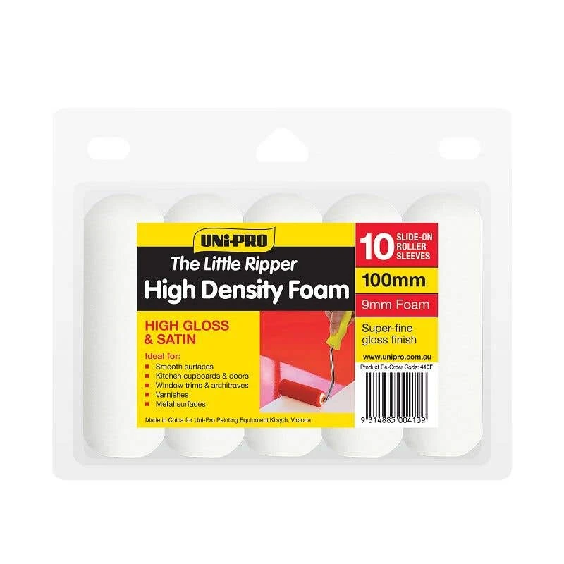 The Uni-Pro The Little Ripper High-Density Foam Rollers 9mm Nap 100mm – 10 Pack is the ideal choice for smooth surfaces, kitchen cupboards and doors, window trims and metal surfaces. These foam rollers have a 9mm nap and are suitable for high gloss paints, satin paints and primers. These rollers are wrapped in 100mm diameter latex foam which creates a softer feel on wood surfaces.