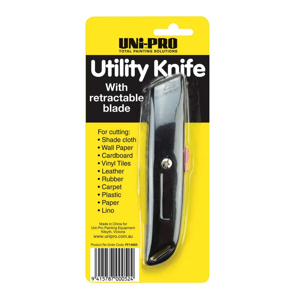 Lightweight, and with a shaped handle for comfort, this versatile utility knife, features a retractable blade for safety and ease of use. Ideal for cutting: shade cloth, wallpaper, cardboard, vinyl tiles, leather, rubber, carpet, plastic and paper.