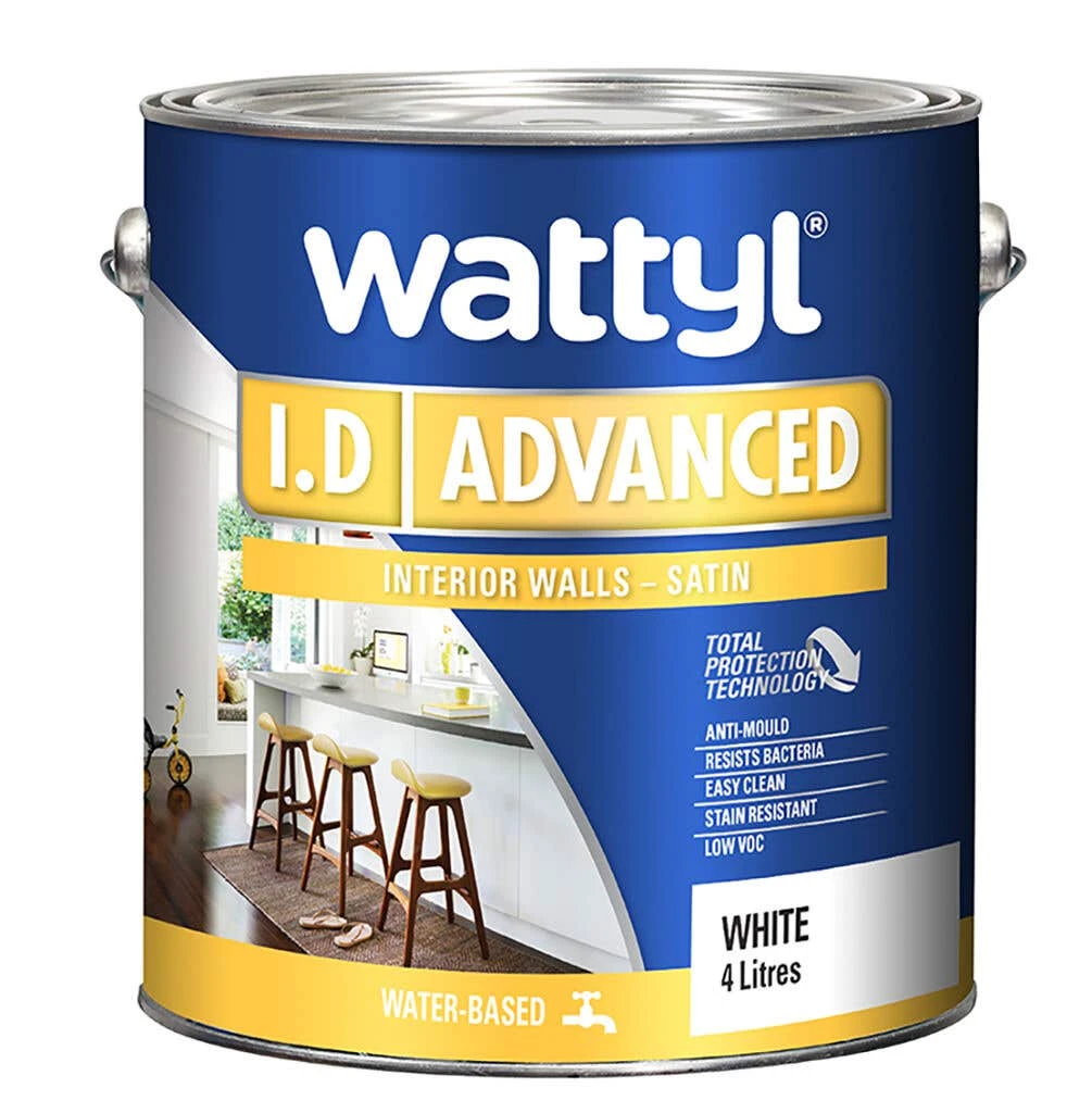 Wattyl I.D Advanced Satin is a high performance, ultra premium paint, delivering new levels of protection and durability. Its Total Protection Technology has unique high performance acrylic polymers and offers mould resistance and bacterial inhibitors. With superior washability and stain resistance, this low VOC formula is also beneficial for indoor air quality. Suitable for use in domestic or commercial environments and where hygienic cleaning practices are used. It provides the best possible surface protection, with anti-mould and bacteria resistance, and easy clean top coat protection.